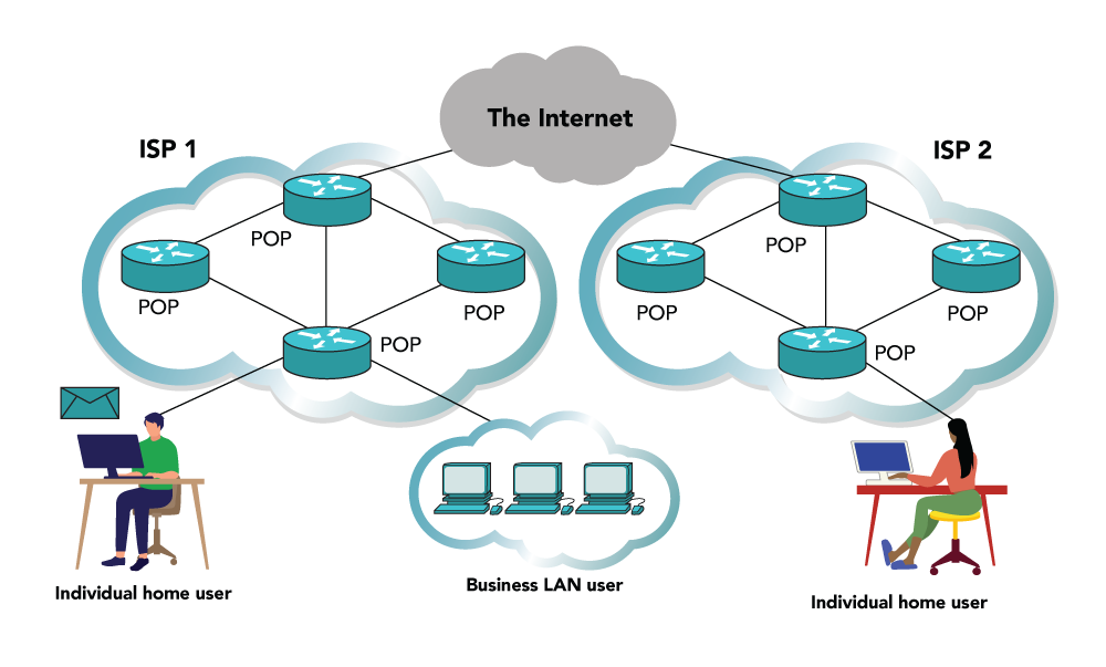 Transit and Peering: ISPs use transit agreements (paid links) or peering arrangements (shared links) to exchange data with networks they do not own.
